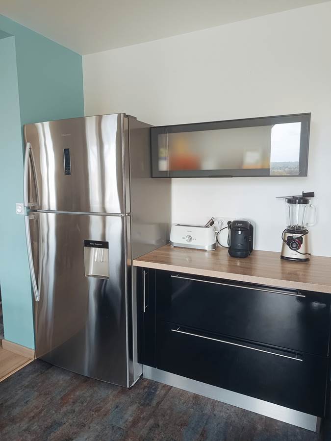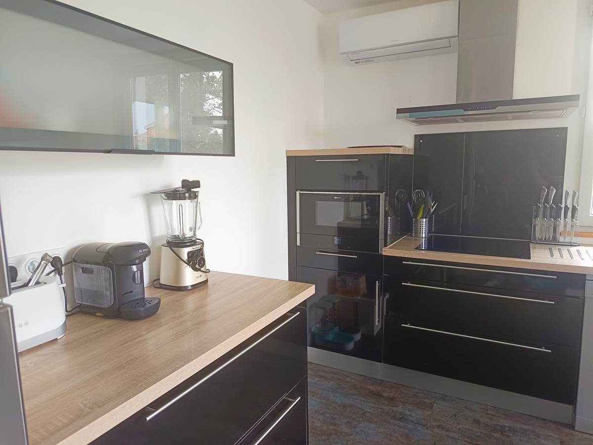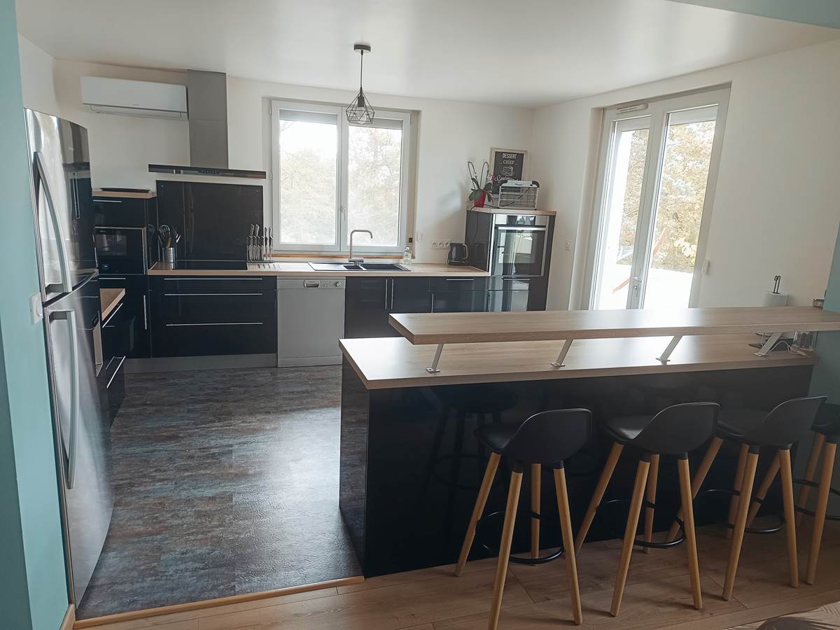 - Une grande pièce de vie comprenant cuisine aménagée ouverte sur salle à manger avec climatisation